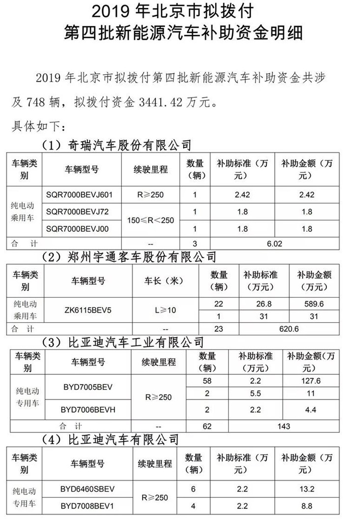 6月11日,北京市经济和信息化局发布《关于2019年北京市拟拨付第四批新能源汽车财政补助资金的公示》,公示《2019年北京市拟拨付第四批新能源汽车补助资金明细》。2019年北京市拟拨付第四批新能源汽车补助资金共涉及7家企业的748辆新能源汽车,拟拨付资金3441.42万元。