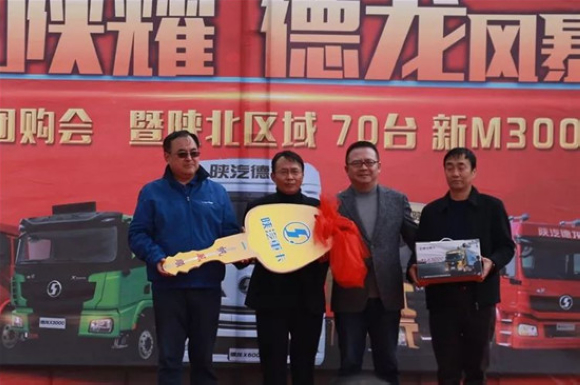 山东时代天成副总经理兼陕西分公司总经理陈绍忠随后致辞:感谢陕重汽及产业链各位领导对于本次活动的鼎力支持,同时感谢渠道经销商和客户朋友对新兴纪元的信赖。在万众瞩目的时刻,由陕重汽副总经理兼销售公司总经理周银朝、山东时代天成副总经理兼陕西分公司总经理陈绍忠将象征着财富与吉祥的黄金钥匙及陕汽重卡车模交给头部客户定边县森豪威油田钻井工程运输有限责任公司董事长孙怀兵和定边县森豪威油田钻井工程运输有限责任公司副总经理王亚虎。