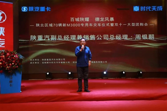陕北区域双十一大型团购会暨70辆新M3000专用车交车仪式在榆林定边盛大举行。此次活动也吸引了二级渠道、终端客户超过两百人到场。陕重汽副总经理兼销售公司总经理周银朝、定边县森豪威油田钻井工程运输有限责任公司董事长孙怀兵、山东时代天成投资有限公司董事副总经理李余、山东时代天成投资有限公司董事副总经理赵宪权、陕重汽销售公司陕西区域总经理王建勋、潍柴动力陕西办事处总经理翟永祥、法士特榆林办事处主任于志远以及山东时代天成副总经理兼陕西分公司总经理陈绍忠及陕西区域陕汽区域经销商、标杆服务站、改装企业等共同出席此次盛会。