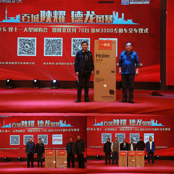 在活动线上答题环节中现场客户朋友积极参与,最终在一片热情紧张的抢答过后,现场产生了6名幸运之星。特邀陕重汽副总经理兼销售公司总经理周银朝为一等奖的获得者颁发奖品;邀请陕重汽销售公司陕西区域总经理王建勋、山东时代天成投资有限公司董事副总经理李余为二等奖获得者颁发奖品;同时邀请潍柴动力陕西办事处总经理翟永祥、法士特榆林办事处主任于志远、陕汽淮南专用车有限公司副总经理张晓军为三等奖获得者颁发奖品。