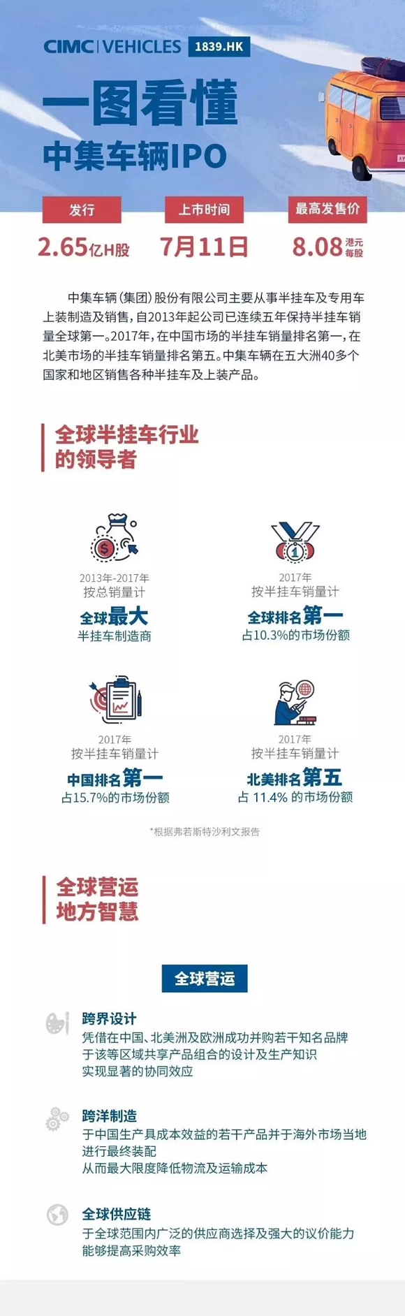 中集车辆是全球半挂车行业领导者,自2013年起半挂车销量已连续5年在全球半挂车行业排名第一,并于2017年拥有10.3%的市场份额(按半挂车的销量计)。中集车辆在中国半挂车行业排名第一(按半挂车销量计),并于2017年拥有15.7%的市场份额;在主要海外市场北美,按半挂车销量计,于2017年跻身五大半挂车制造商之列。