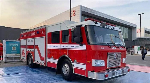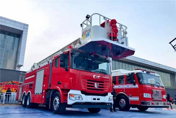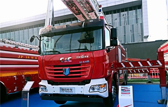其中,中集联合卡车多功能云梯消防车,采用联合卡车U440底盘和单独开发的低顶驾驶室,方便消防车在城市复杂路况下行驶,并利于布置举升斗的举升空间;该装置能升到10层以上救援被困群众,一次性最多可承载500kg(7-8人)负载,适合城市小区高层灭火,保卫居民的生命财产安全。