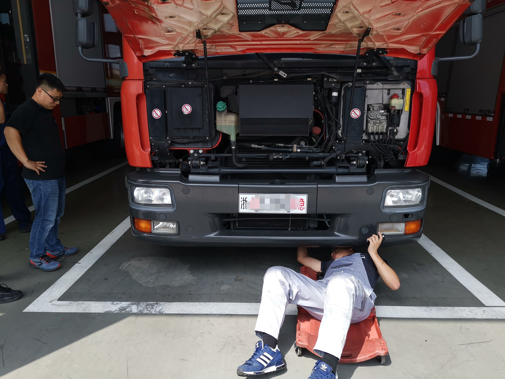在此次的消防巡检工作中,来自曼恩的底盘专家从车辆外观、电气系统以及底盘等三个方面展开检查。其中,对车辆外观配件尤其是灯光系统的检查,能够有效确保车辆功能的完整性并保证夜间行驶的安全性。通过对整车电气系统及故障码的检测,可有效排查电气老化导致的潜在风险并避免抛锚现象的发生,从而保证救援的时效性。消防车属于特种车辆,在救援过程中可能遇到各种突发性复杂状况,底盘需要经过各种严峻作业场景的考验,因此底盘部件使用状况的检查尤为重要。通过排查底盘零部件、漏油、动作不良以及部件异常损坏等情况,可进一步排除车辆的潜在安全隐患,确保车辆正常使用,保证救援的时效性。