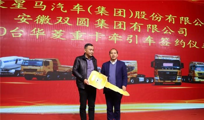 安徽双圆集团有限公司现场订购100辆华菱重卡牵引车,并举行签约仪式。葛晓生将象征财富的金钥匙交付到了胡传峰手中。