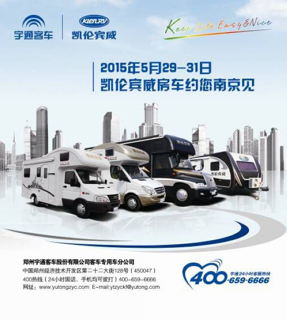 2015南京度假休闲及房车展览会将于2015年5月29日至31日在南京国际博览中心举办。宇通凯伦宾威房车将携四款经典车型诚意亮相,其中不仅包括历届展会中明星自行式房车,亦有满足营地整体解决方案的经典拖挂房车。届时凯伦宾威将会根据您的需求提供更多的专属定制服务,诚邀广大车友们品鉴体验,带上您的家人,约上朋友,一起体验凯伦宾威的“越自在,越精彩”吧!