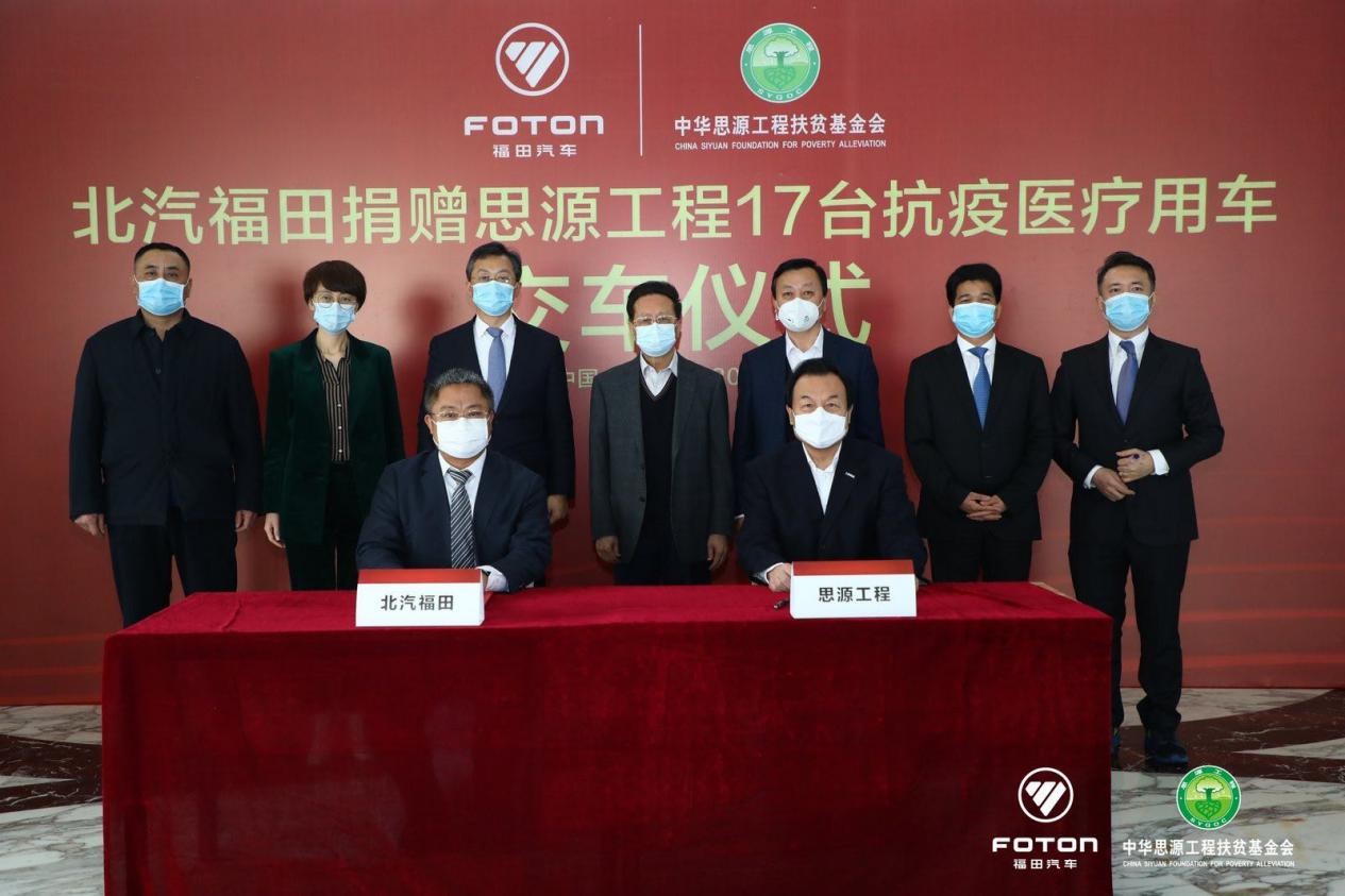 交车现场,福田汽车与“思源工程”签署捐赠协议,并向“思源工程”捐赠10台福田风景负压救护车、5台福田图雅诺负压救护车、2台福田奥铃医疗废物转运车,价值485万元,用于支援湖北省、湖南省、新疆等8省(市、自治区)抗击新冠肺炎疫情。随后,17辆医疗保障用车一并从福田汽车山东多功能汽车厂出发直达疫情一线,助力防疫工作持续开展。