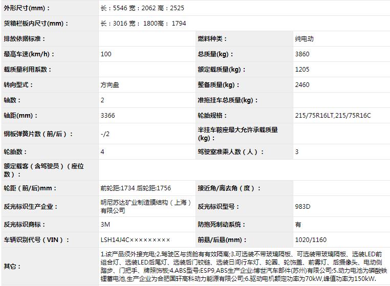 这四款EV90纯电动物流车轮胎规格均为215/75R16LT、215/75R16C,前轮距1734mm,后轮距1756mm,前悬/后悬为1020/1160mm,最高车速100km/h,驾驶室准乘人数为3;反光标识型号为983D,生产自明尼苏达矿业制造膜结构(上海)有限公司。
