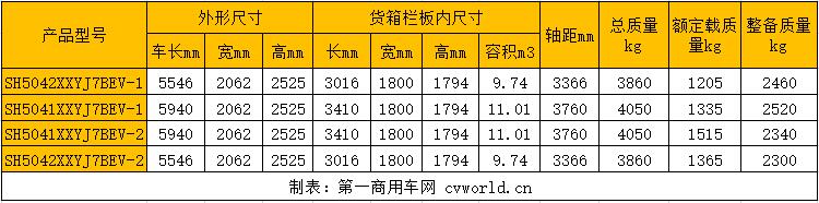其中第一款EV90,型号SH5042XXYJ7BEV-1,总质量3860kg,整备质量2490kg,额定载质量为1205kg;第二款EV90,型号SH5041XXYJ7BEV-1,总质量4050kg,整备质量2520kg,额定载质量为1335kg;第三款EV90,型号SH5041XXYJ7BEV-2,总质量4050kg,整备质量2340kg,额定载质量为1515kg;第四款EV90,型号SH5042XXYJ7BEV-2,总质量3860kg,整备质量2300kg,额定载质量1365kg。可以看到,上榜公告的四款EV90纯电动物流车额定载重有四种,分别为1.205吨、1.335吨、1.515吨和1.365吨,最高载重1.515吨。