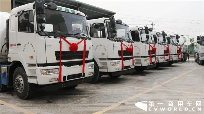 在交车仪式现场,数十辆华菱星马轻量化智能搅拌车披红挂彩、整装待发,即将在它们全新的征程上大放光彩。