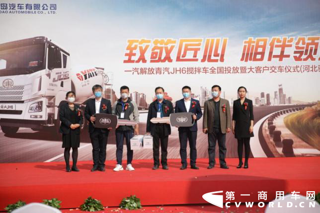 25日下午,以“致敬匠心 相伴领航”为主题的,一汽解放青汽JH6搅拌车全国投放暨大客户交车仪式在河北池洋举行,首批共50辆成功交付。在交车仪式上,一汽解放青岛汽车有限公司(下简称“一汽解放青汽”)副总经理纪师胜和唐山亚特专用汽车有限公司(下简称“亚特重工”)总经理田明辉分别在线上致辞,分享JH6搅拌车的诞生故事,为JH6搅拌车全国投放送上祝福。