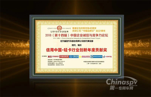 2018年5月10日,“2018(第十四届)中国企业诚信与竞争力论坛暨全国改革创新成果案例推介展示活动”在京举行。本次活动以“中国开启品牌塑造新时代”为主题,聚焦新时代中国企业家群体,探寻其成长路径与创新探索。福田时代凭借其出众的科技创新实力评获“信用中国·轻卡行业创新年度贡献奖”。