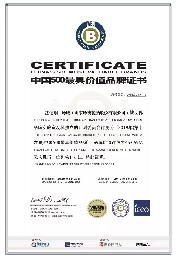由世界品牌实验室(World Brand Lab)主办的(第十六届)“世界品牌大会”于6月26日在北京举行,会上发布了2019年《中国500最具价值品牌》分析报告。在这份基于财务数据、品牌强度和消费者行为分析的年度报告中,玲珑轮胎品牌价值453.69亿元,再创历史新高!位列中国500最具价值品牌榜第116名。