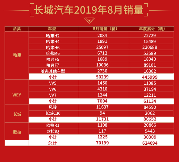 虽然一直被质疑过于依赖SUV,然因为较早布局,长城汽车的哈弗家族已然赢得先机和较大市场份额。因此,即使在SUV市场逐步萎缩的情况下, 哈佛品牌依旧保持了其在该细分市场中的王者地位。数据显示,8月,哈弗品牌销量达50239辆,同比增长17.04%。1-8月,哈弗品牌累计销量接近45万辆,达445999辆,实现9.98%的同比增长。