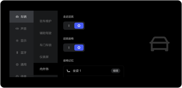 7、新增座椅迎宾功能,用户可在设置-车辆-内外饰中开启此功能。