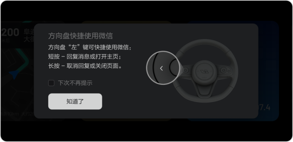 11、调整了方向盘左侧“左键”为微信键,用户可点击方向盘左侧的“左键”完成打开微信、回复消息等功能。