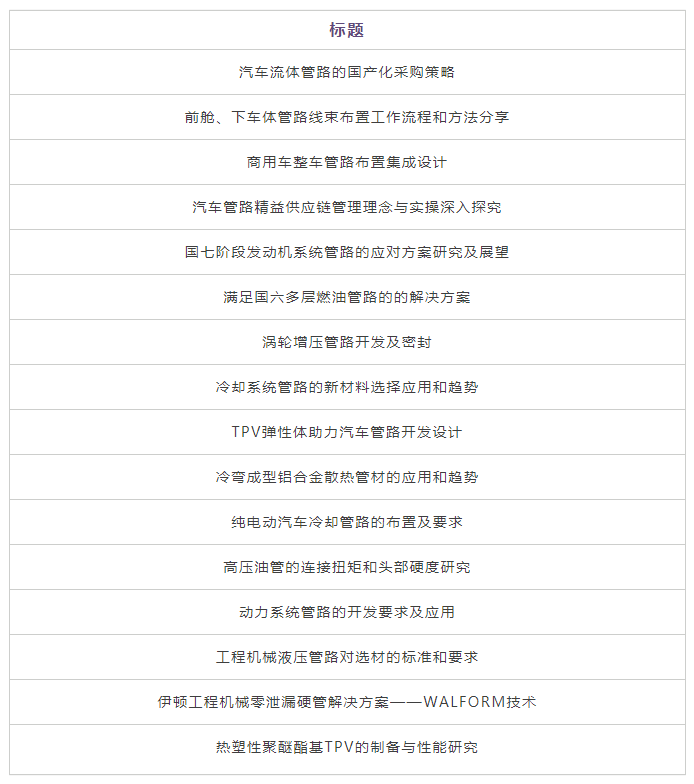 2020年第四届汽车管路系统峰会将将聚焦市场的挑战和机遇、设计及优化布置、新材料、工艺自动化、新能源等多个热点,本届峰会设置30+热点话题,20+焦点话题,会议期间还特设一对一配对专区,是汽车管路行业不可错过的年度盛会!