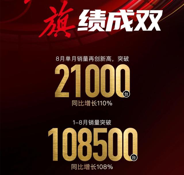 日前,一汽红旗公布了8月最新销量数据,8月销量突破2万辆,达到2.1万辆,同比增长110%,月度销量再创新高,同时这也是红旗品牌今年的“八连涨”;今年1-8月,红旗累计销量为10.85万辆,同比增长108%,增势十分喜人。