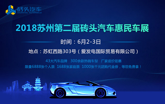 2018苏州第二届砖头汽车惠民车展将于6月2-3日在苏州市工业园区苏虹西路303号(爱发电国际贸易有限公司)盛大开幕!展会为期2天,每天9:00-17:30。本届车展现场将汇集国内外近43个汽车品牌参展,涵盖了车市所有热销品牌及车型。