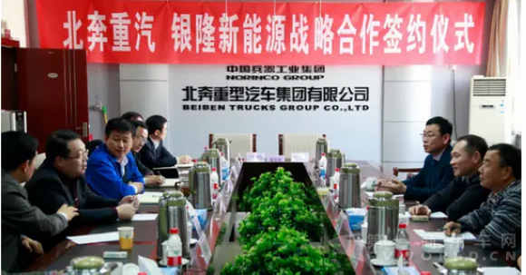近日,北奔重汽集团公司与珠海银隆新能源公司签订纯电动车、纯电动客车桥开发战略合作协议。银隆新能源公司副总裁李贤能一行与包头市投资促进局局长王奋伟、青山区区长胡荣、北奔重汽集团董事长王世宏、总经理汪宝营进行座谈。北奔重汽集团副总工程师庞建中、总经理助理李功赋及相关部门领导也参加了座谈。