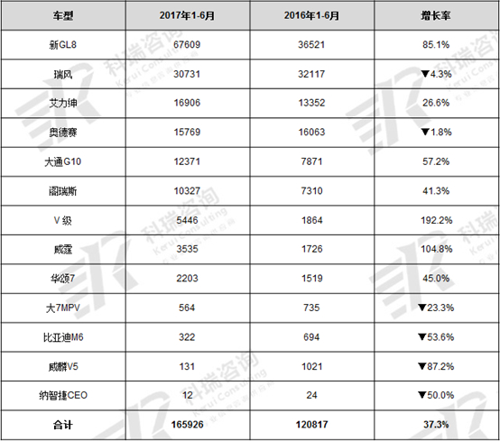 2017年上半年国内整个汽车市场累计销量达1335.38万辆,同比增长3.8%;狭义乘用车累计销量1093.63万辆,同比增长2.7%;而同期商用车累计销量达210.09万辆,同比增长17.4%(见表1)。这是近年来首次乘用车销量增长率低于整个汽车市场增长率的现象,实属罕见。MPV是狭义乘用车中的小市场,其占有率,从去年同期的11.3%,陡降至9.2%。