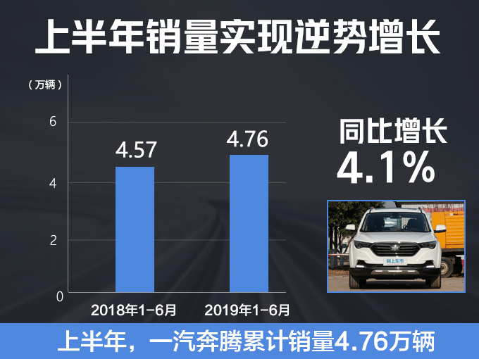 从一汽奔腾官方了解到,一汽奔腾6月销量为13,434辆,同比增长167%。今年上半年累计销量近5万辆,同比逆势增长4.1%。2019年作为一汽奔腾完整贯彻新品牌理念的第一年,还将推出更多有力的新产品来推动其销量的增长。今年下半年将陆续推出3款新SUV车型“助阵”。