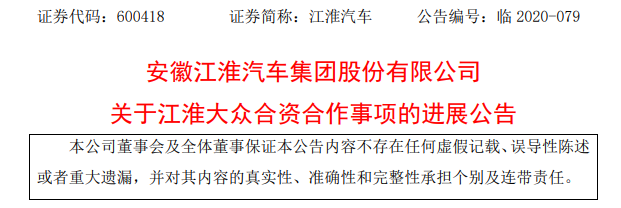 2020年6月11日,相关方签署相关协议,详见《安徽江淮汽车集团股份有限公司关于安徽省国资委、大众中国投资、江汽控股签署<关于安徽江淮汽车集团控股有限公司投资协议>的公告》(公告编号:临2020-040)、《安徽江淮汽车集团股份有限公司、江淮大众汽车有限公司和大众汽车(中国)投资有限公司签署<关于江淮大众汽车有限公司的投资协议>的公告》(公告编号:临2020-041)、《安徽江淮汽车集团股份有限公司和大众汽车(中国)投资有限公司签署<关于江淮大众汽车有限公司之产品组合框架协议>的公告》(公告编号:临2020-042)。