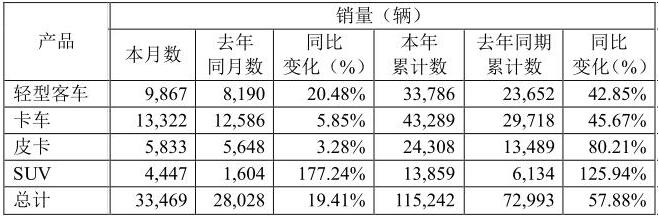 4月份,江铃皮卡实现销售5833辆,同比增长3.28%;1-4月,江铃皮卡累计销售24308辆,同比增长80.21%。