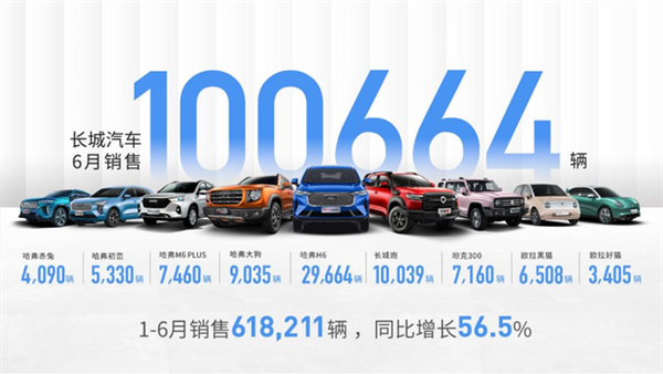 长城汽车1-6月销量近62万台 同比增长56.5%
