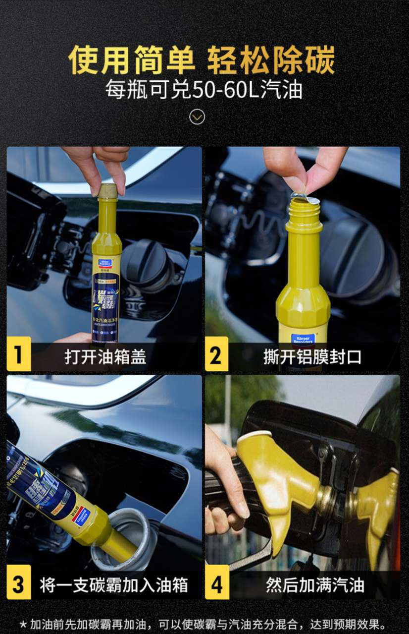 固特威碳霸的使用方法也非常简单,首先打开油箱盖,撕开铝膜封口,将一支瓶碳霸加入油箱之后再加满汽油,就可以实现充分的除积碳效果,同时还能提升油品质量、清洁燃油系统。一瓶碳霸,就能时刻保持燃油系统的清洁畅通,让发动机持续焕发强劲动能。