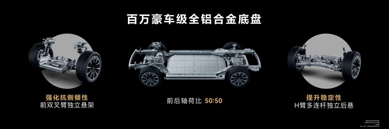 EV基于纯电驱智能平台打造,具有高性能、长续航和智能化等优势。新车搭载前交流异步电机+后永磁同步电机,四驱组合总功率达365kW,百公里加速4.55秒,并采用赛力斯汽车饱受好评的全铝合金底盘,配合前双叉臂+后H臂多连杆铝合金独立悬架组合,让车身在不同驾驶状态下都能保持更好的驾驶稳定性,拥有媲美超跑的操控体验。