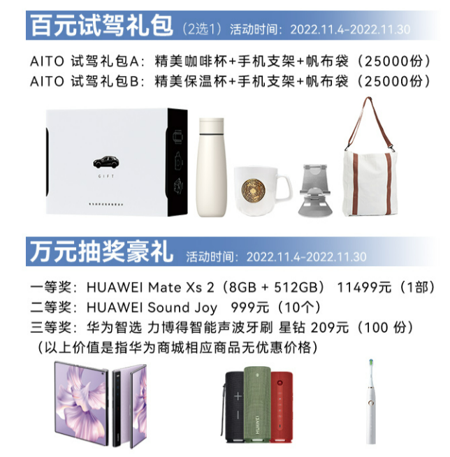 活动期间,通过AITO App报名活动,并到店试驾,即可获赠AITO试驾礼包并参与抽奖,详细规则以AITO App或活动页面为准。