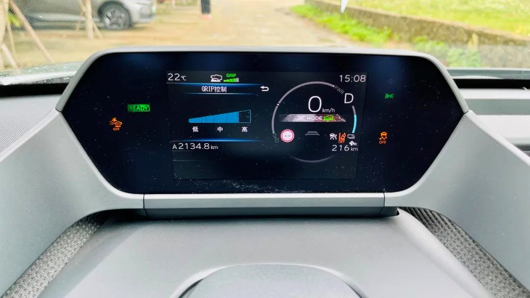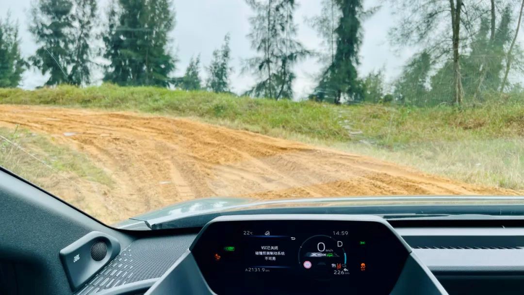 在途中有三段较为泥泞的路段,可以明显看出车辙较深,车轮的附着力也会变差,一不小心就可能深陷其中。如果是普通的燃油SUV,看到这样的路况估计就望尘莫及了。但在bZ4X上,只需将模式调到积雪/泥泞,此时仪表会提示VSC和碰撞预测制动系统已关闭,我可以放心地握好方向盘,踩住动力踏板全力冲刺就行。那种顺利通过之后的成就感,是我在其他城市SUV上所不曾有过的。