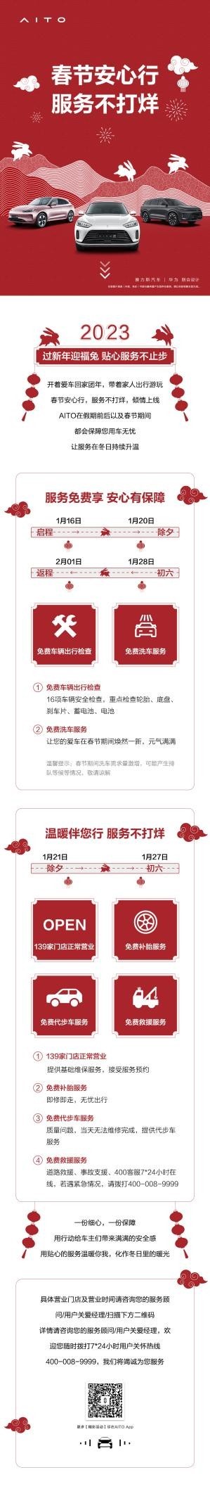 对于AITO问界来说,一台新车的交付,只是服务的开始。AITO问界以用户为中心,秉承“无忧服务”理念。在2023年春节期间,AITO问界为用户带来春节暖心大礼。在春节假期前后以及春节期间,AITO品牌倾情上线春季安心行,服务不打烊活动,保障用户用车无忧。