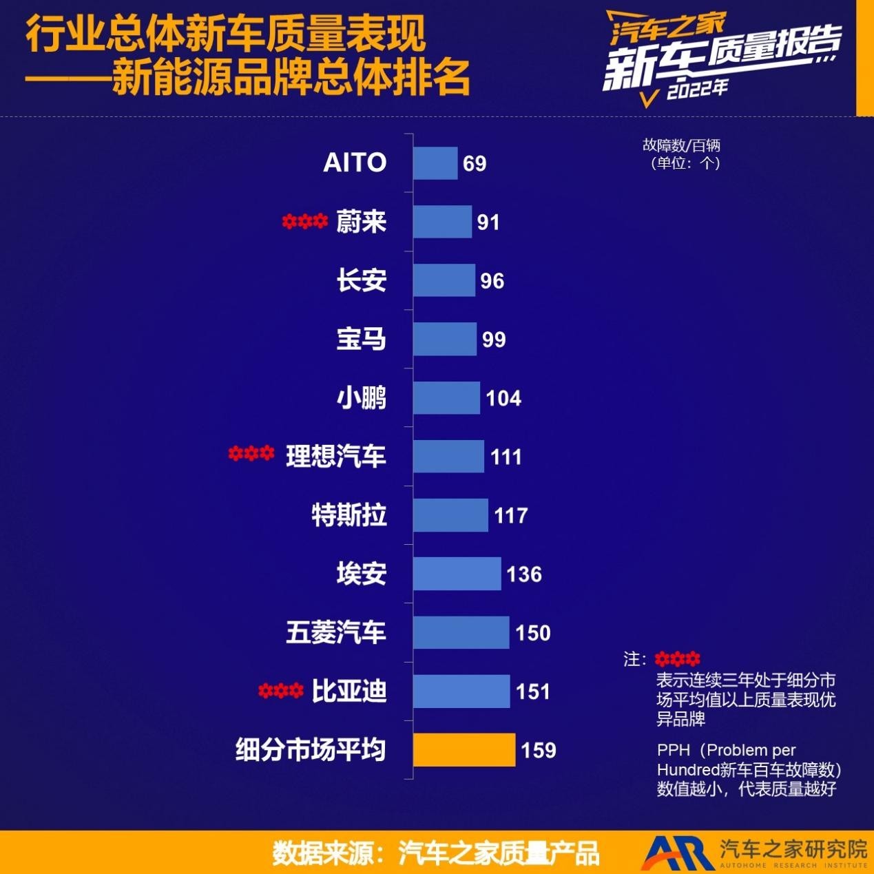 今年的报告显示,2022年中国品牌新车质量的平均PPH值是156,故障数较2021年的149有所上升,说明中国汽车品牌一年内的品质表现,正呈现出下滑趋势。在这样的行业背景下,赛力斯与华为联合设计的AITO问界系列车型,一年间跃升至PPH新能源品牌榜冠军、中国品牌榜亚军领先位置,质量与品质表现出色,实属难得。