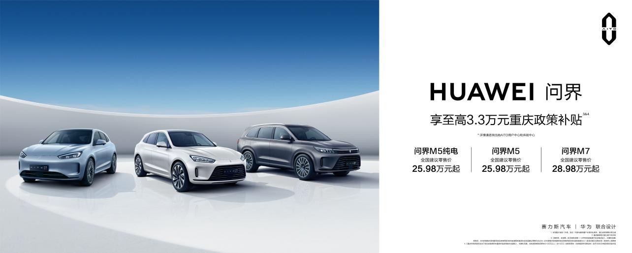 在优异的产品力上,近期,重庆还释放了数轮新能源购车补贴政策,根据《重庆市商务委员会关于优化实施乘用车置换补贴政策的补充通知》、《惠民生、促消费、助力绿色发展——沙坪坝区新能源汽车促销活动》,现在重庆新购问界M7全系、问界M5纯电全系、问界M5后驱标准版及四驱至臻版任一车型,并最终提车的自然人消费者,可享至高3.3万元的地方政策补贴,包含2万元现金补贴、价值1万元的购车礼包以及3000元市级财政资金补贴。