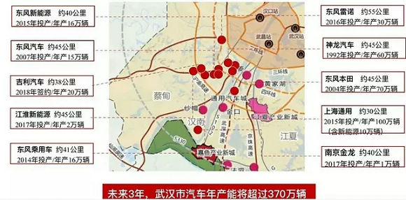 今年吉利签约后,武汉市将在蔡甸区、江夏区等地区,构建出未来3年产能超370万辆的汽车生产基地群。