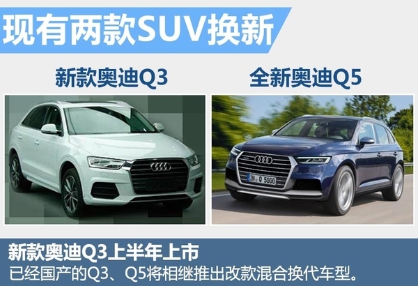 奥迪Q3的中期改款将在今年上半年迎来中期改款,除采用全新家族式前脸设计以外,车身尺寸也进行了小幅调整。动力方面,新车将搭载一款全新的2.0T发动机,通过不同调校,可实现高、低功率两种不同版本。全新一代奥迪Q5将有望在明年实现国产上市,新车将基于大众最新的MLB Evo模块化平台打造,与现款车型相比,车身预计将减重100公斤。外观上也将借鉴全新一代Q7的设计理念,在现款车型的基础上加入更多硬朗的线条。