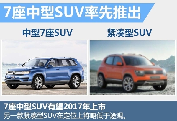 随着一汽-大众长春、成都、佛山、天津、青岛五大生产基地的建成,将为大众在华布局SUV产品提供必要条件。未来,将率先在一汽-大众投产的有望是一款中型7座SUV,新车定位在途观和途锐之间。这款中型SUV将采用大众全新的MQB模块化平台进行打造,预计2017年在国内投产上市。另外一款SUV在定位上将略低于途观,推出后将竞争国内最火爆的紧凑级SUV细分市场。