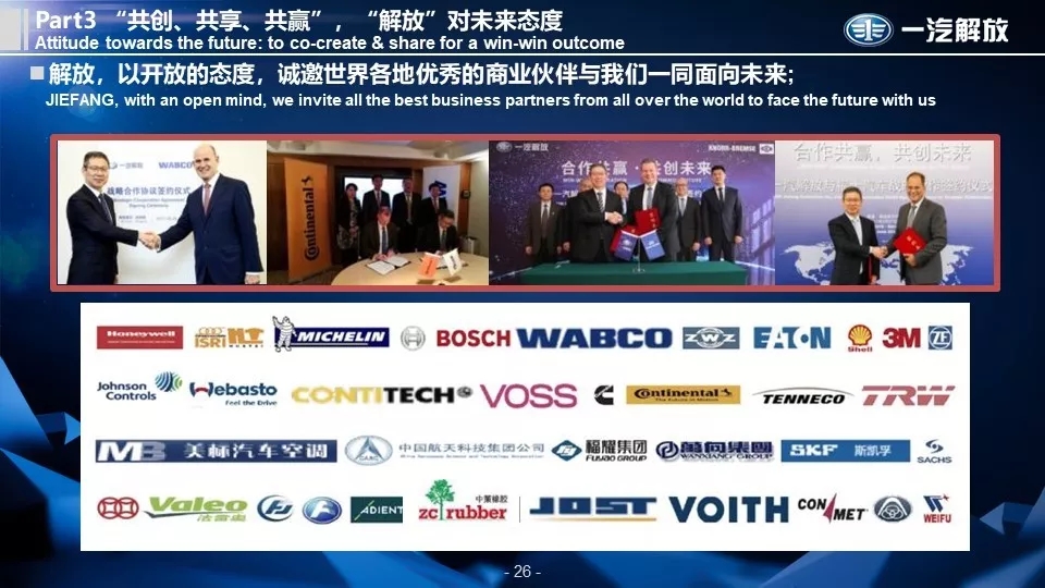 )给我这个机会同大家分享一些观点。我希望能通过这个机会,加深各位对解放的认识和理解,也希望在座的各位能与解放建立更深刻的友谊,同时,祝愿在座的各位商业顺利,祝我们共同的商用车市场,蒸蒸日上!谢谢各位!