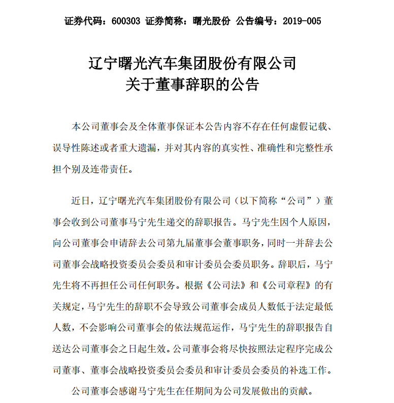 曙光汽车在发布年度业绩预亏公告的同一天,曙光股份还发布了关于董事辞职的公告。
