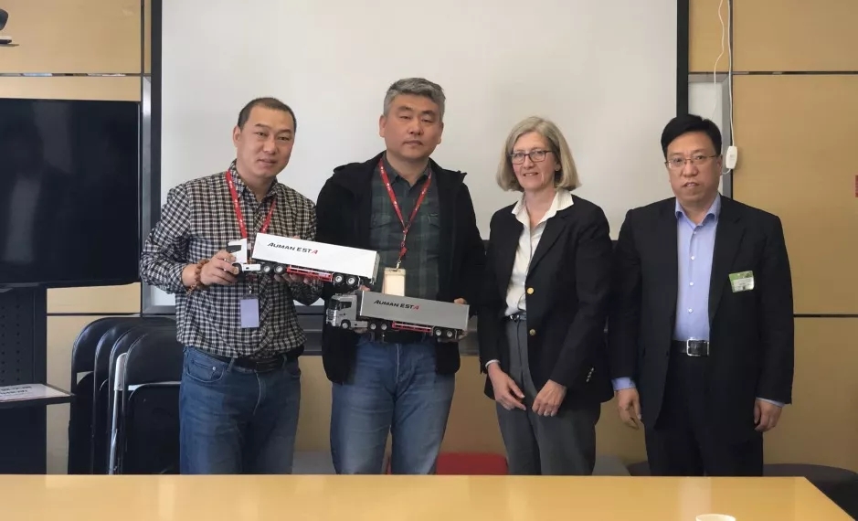 最后,福田戴姆勒汽车总裁Kelley Platt向京东物流代表赠送了欧曼EST超级重卡车模并合影留念。