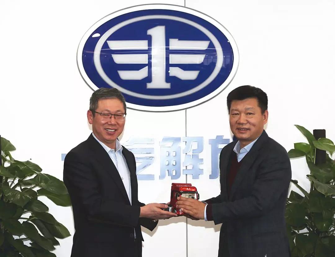 一汽解放董事长胡汉杰向中联环境CEO张建国赠送J7限量版车模