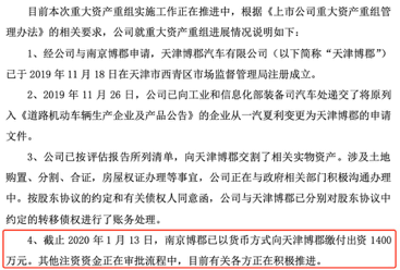 而公告内容指出,截至2020年1月13日,南京博郡已以货币方式向天津博郡缴付出资1400万元,其他注资资金仍在审批流程中。