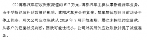 2020年1月,北京北斗星通导航技术股份有限公司发布的一份公告显示:受新能源补贴政策影响,博郡汽车资金链紧张,整车整体项目均处于停工状态,所欠北斗星通应收账款从2019年7月开始逾期,相关应收账款已减值约617万元。