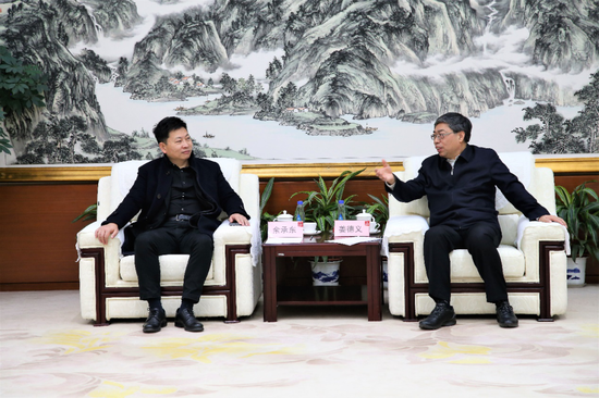 北汽集团党委书记、董事长姜德义(右)与华为消费者BG总裁余承东(左)会面