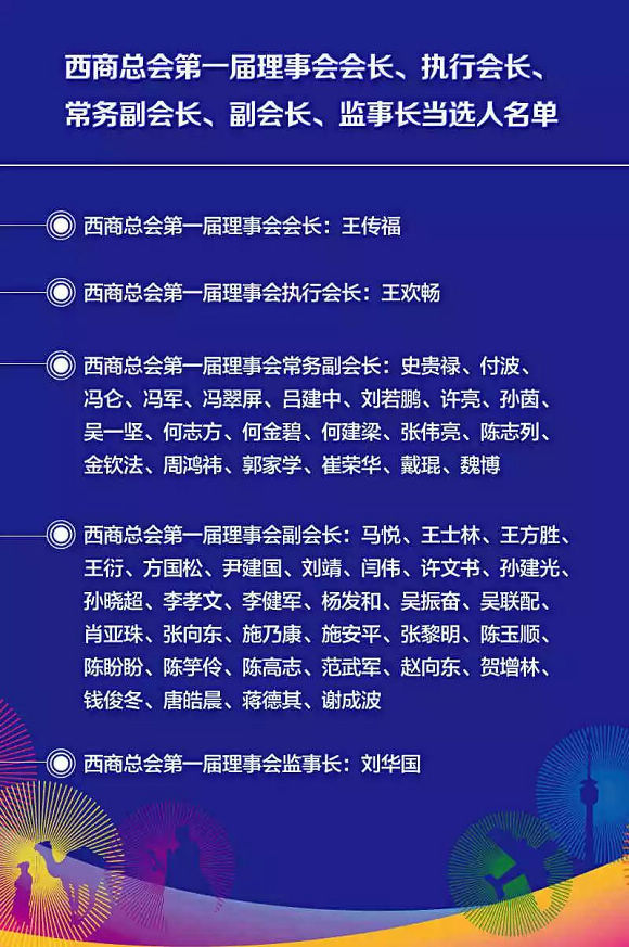 新西商”为主题。作为大会的重头戏,西商总会在29日当天选举出第一届领导班子,比亚迪董事长兼总裁王传福当选首任西商总会会长,西安市政协副主席、工商联主席王欢畅当选执行会长。在“一带一路”建设不断深入的大背景下,比亚迪将为西安这一“一带一路”重要节点城市的跨越式发展添砖加瓦,实现互利共赢、共同发展。