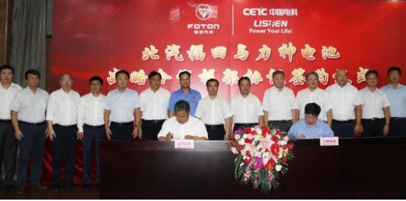2018年8月31日,福田汽车集团与天津力神电池股份有限公司在津签署战略合作协议。北汽集团总经理、福田汽车集团董事长张夕勇,中国电子科技集团有限公司副总经理杨军,中国电子科技集团有限公司副总工程师、中电力神党委书记、董事长周春林,中电力神副董事长、天津力神党委书记、董事长秦兴才,福田汽车集团副总经理武锡斌,福田汽车集团副总经理、新能源汽车业务总监杨国涛等领导共同出席签约仪式并见证双方的战略签约。
