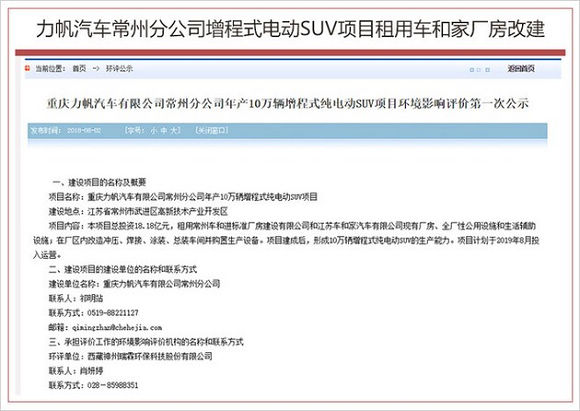 近日,盖世汽车从江苏环保局获悉:重庆力帆汽车有限公司常州分公司将在常州建设年产10万辆增程式纯电动SUV项目。