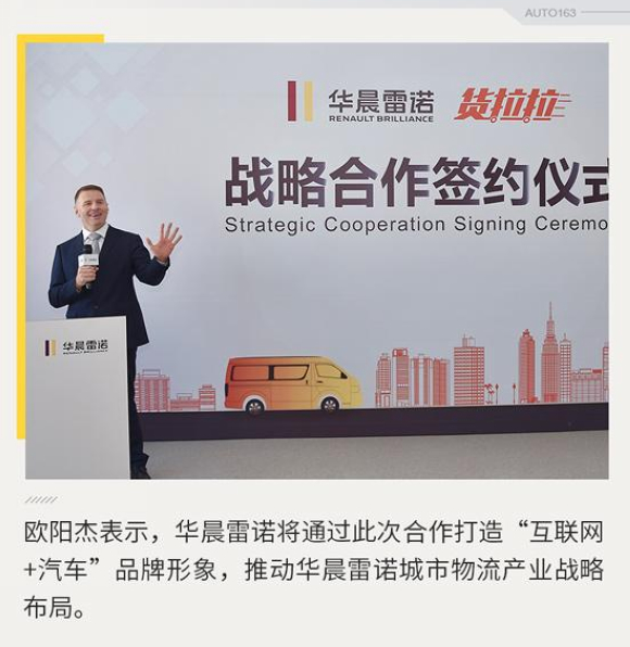 华晨雷诺金杯汽车有限公司CEO欧阳杰表示,华晨雷诺将通过此次合作打造“互联网+汽车”品牌形象,推动华晨雷诺城市物流产业战略布局。未来,华晨雷诺将以电动化、互联网化、智能化、物联网化和共享化为发展方向,实现整车资源与城市物流平台结合,降低物流成本,开拓城市配送物流新格局。