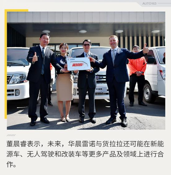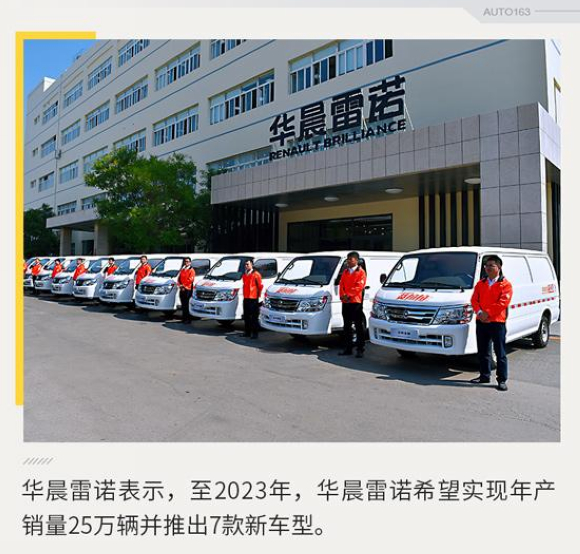 据悉,至2023年,华晨雷诺将实现年产销量25万辆并推出7款新车型,华晨雷诺金杯汽车有限公司副总裁董晨睿表示,未来,华晨雷诺与货拉拉还可能将在新能源车、无人驾驶和改装车等更多产品及领域进行合作。